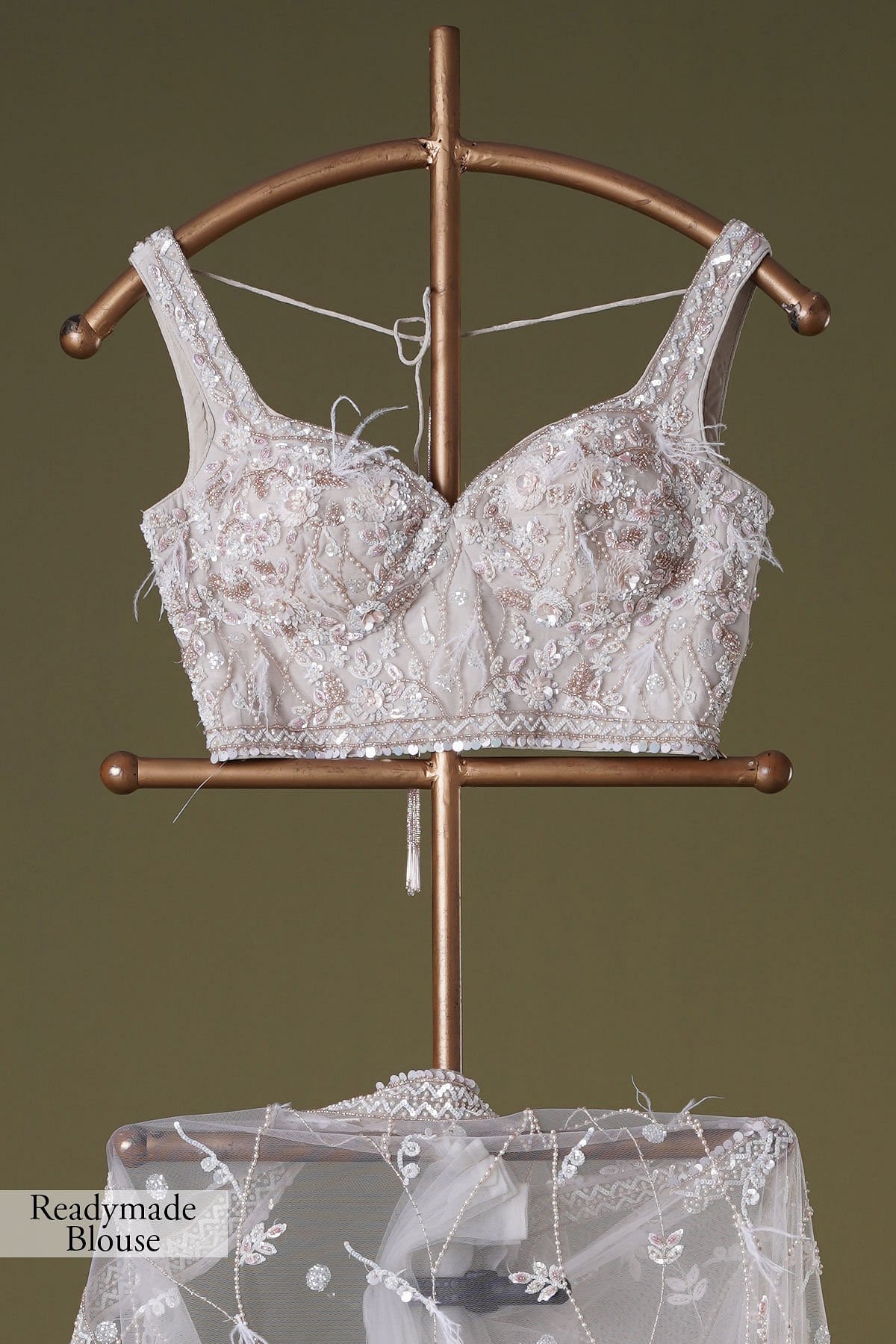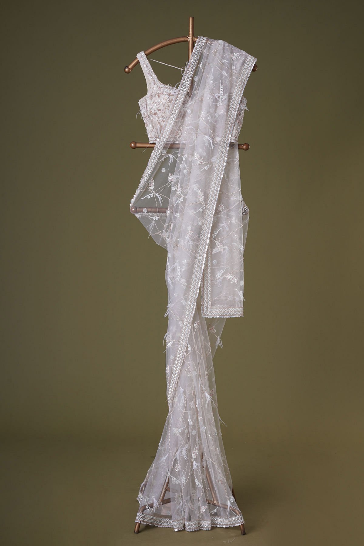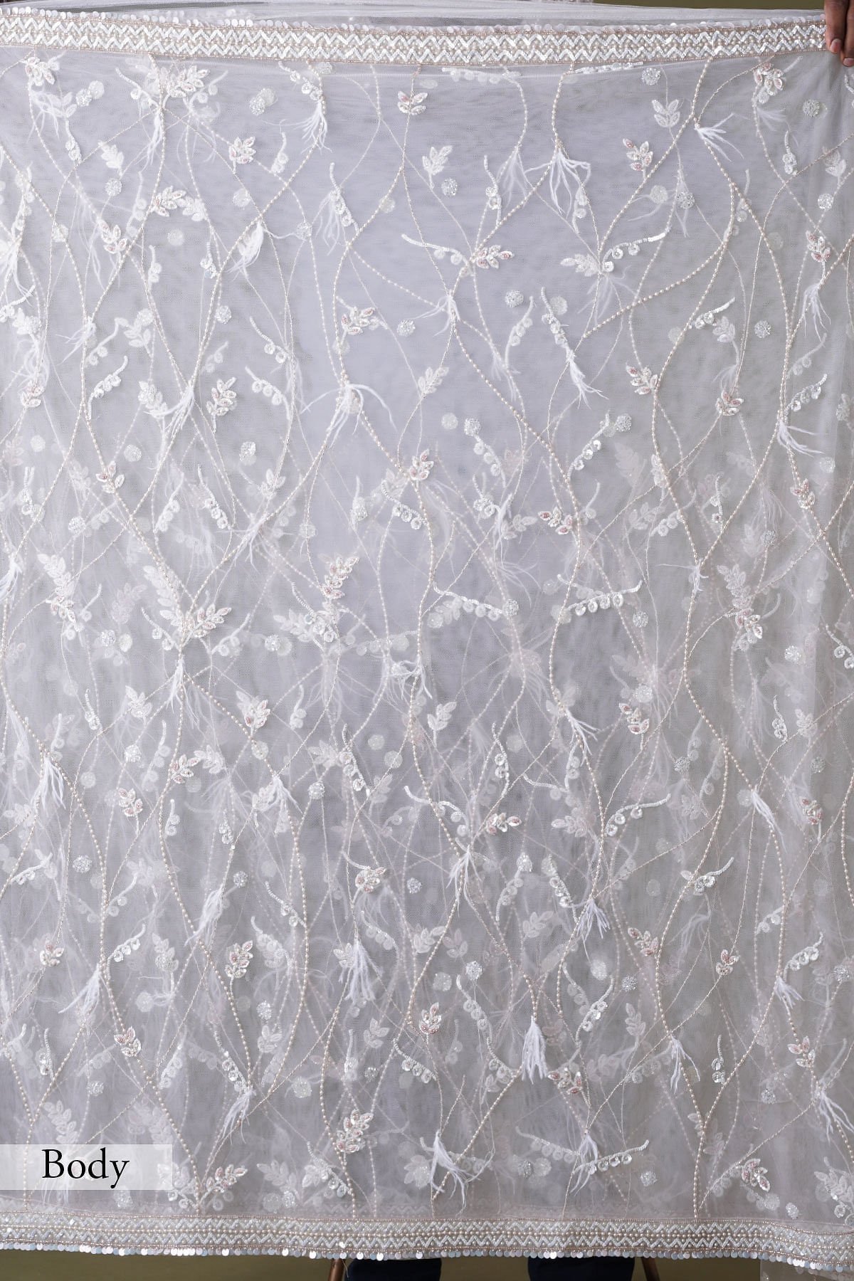 The all-over pattern, meticulously embroidered, presents a harmonious fusion of timeless grace and modern sophistication. The saree’s inherent purity radiates through its delicate hue, reminiscent of the gentle shade of coconut milk beige. The intricate bead, sugarbead, sequins, pearl, and resham work adorning the saree creates a symphony of textures, playing with light and intricacy to bestow an ethereal radiance upon the wearer. The saree’s border and pallu bear witness to the meticulous craftsmanship that defines this creation. A delicate blend of pink and off-white hues graces the net border, adding a touch of femininity and sophistication. The readymade blouse is made up of Organza fabric with the bead, sugarbead, sequins, pearl, and resham work on the blouse mirrors the saree’s resplendence. Whether for grand occasions or cultural celebrations, this saree promises to be a symbol of timeless elegance, leaving an indelible mark of sophistication and grace. There might be a little color variation in the image and original product due to photographic lighting sources or your monitor settings.