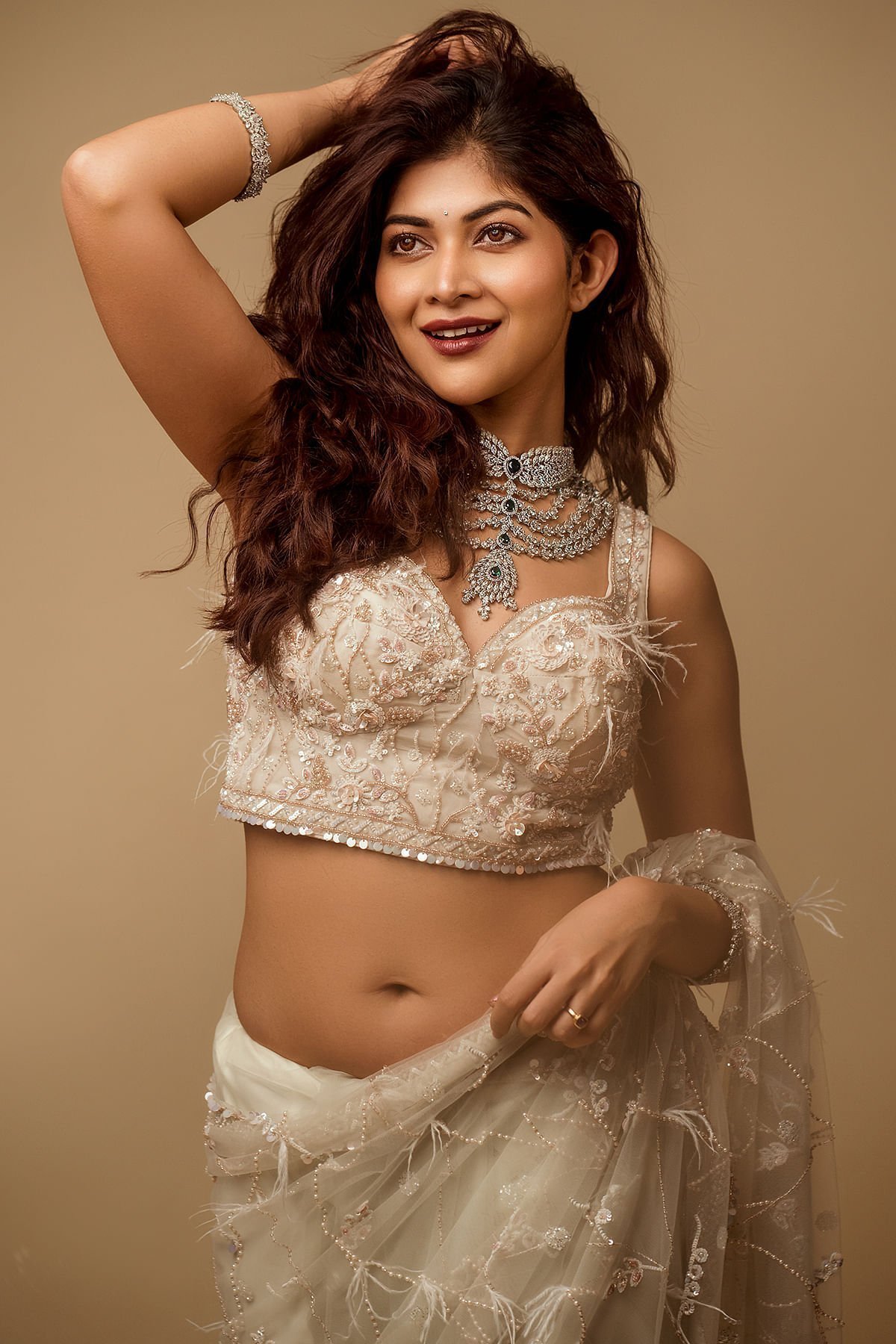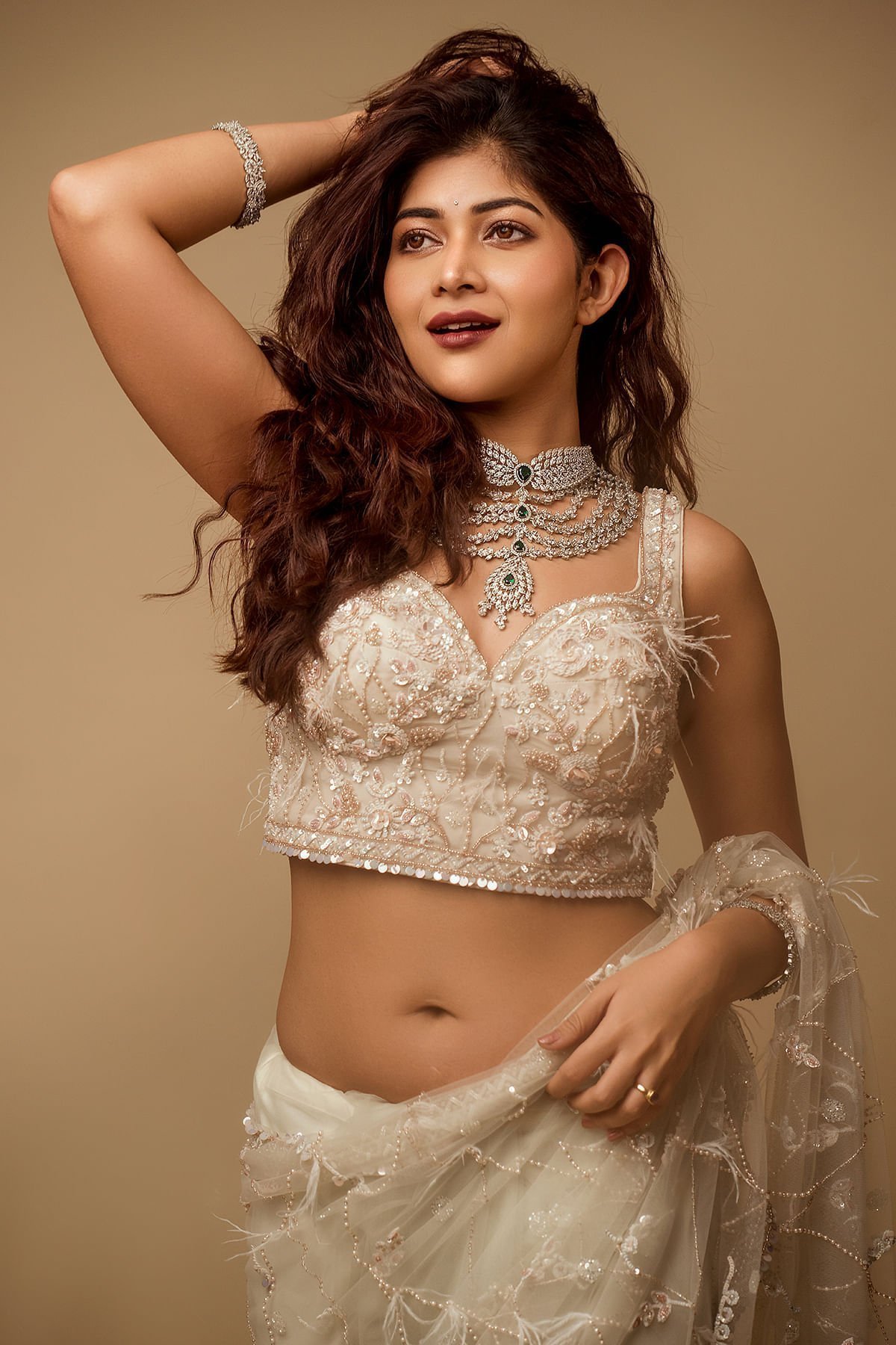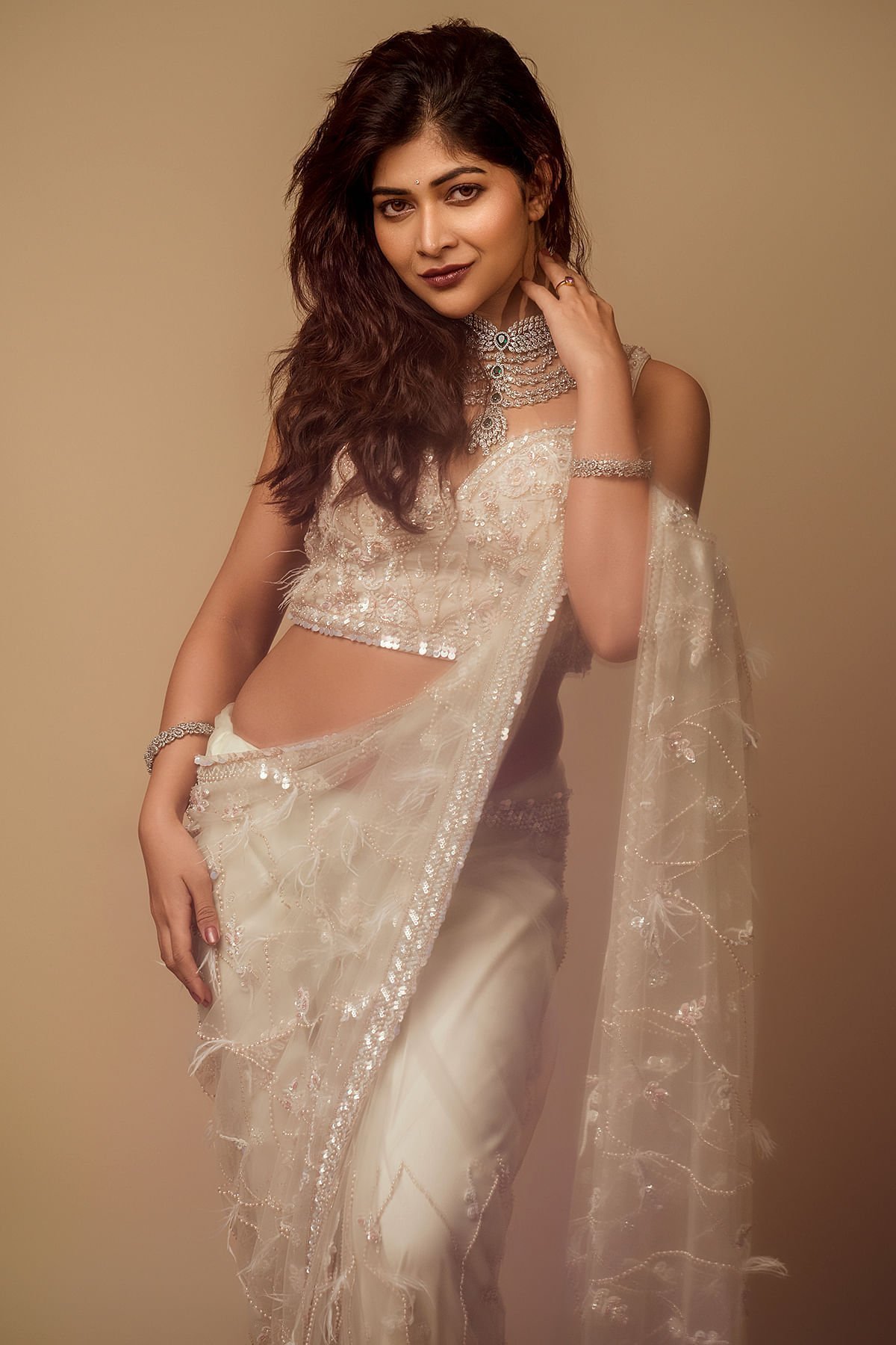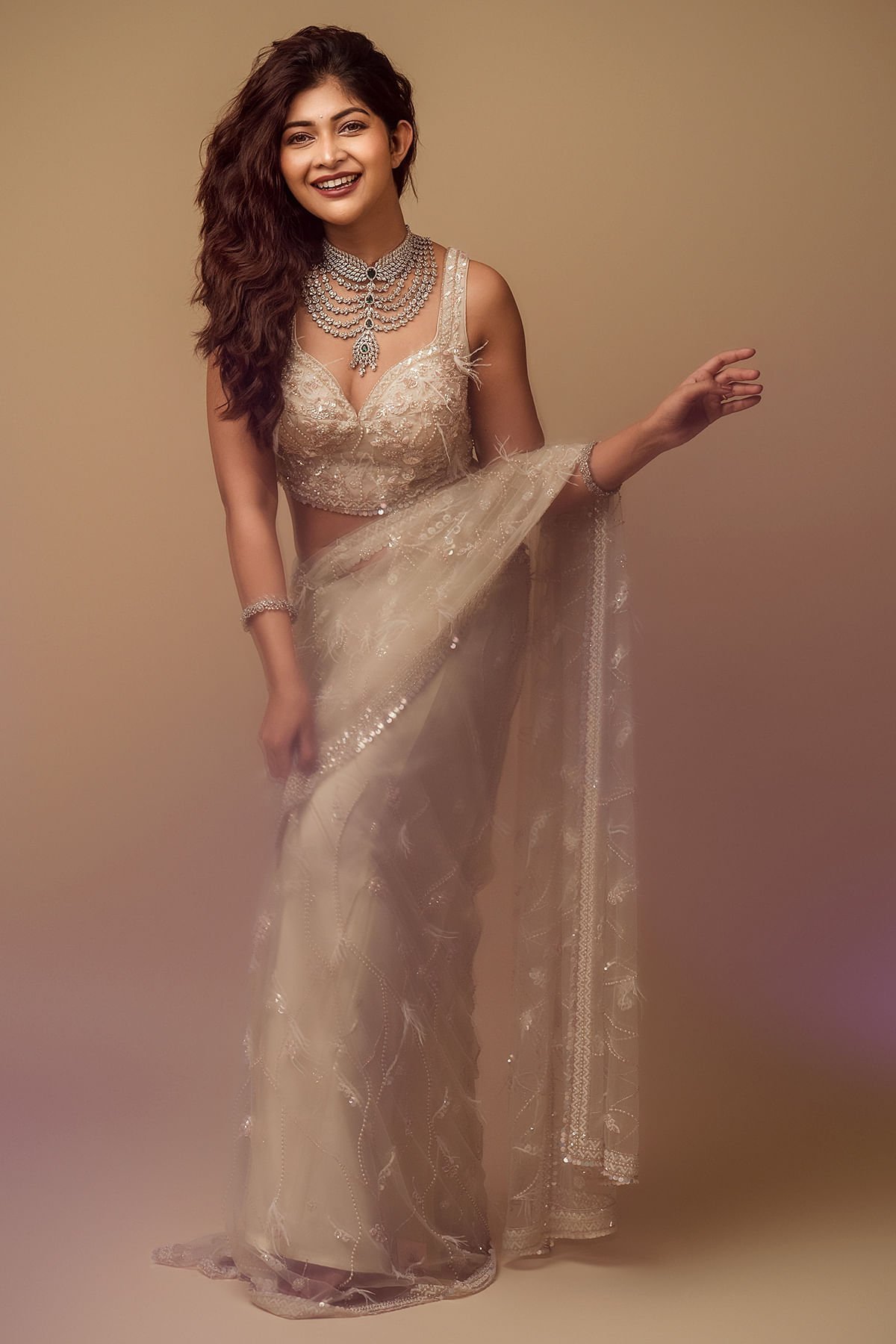 The all-over pattern, meticulously embroidered, presents a harmonious fusion of timeless grace and modern sophistication. The saree’s inherent purity radiates through its delicate hue, reminiscent of the gentle shade of coconut milk beige. The intricate bead, sugarbead, sequins, pearl, and resham work adorning the saree creates a symphony of textures, playing with light and intricacy to bestow an ethereal radiance upon the wearer. The saree’s border and pallu bear witness to the meticulous craftsmanship that defines this creation. A delicate blend of pink and off-white hues graces the net border, adding a touch of femininity and sophistication. The readymade blouse is made up of Organza fabric with the bead, sugarbead, sequins, pearl, and resham work on the blouse mirrors the saree’s resplendence. Whether for grand occasions or cultural celebrations, this saree promises to be a symbol of timeless elegance, leaving an indelible mark of sophistication and grace. There might be a little color variation in the image and original product due to photographic lighting sources or your monitor settings.